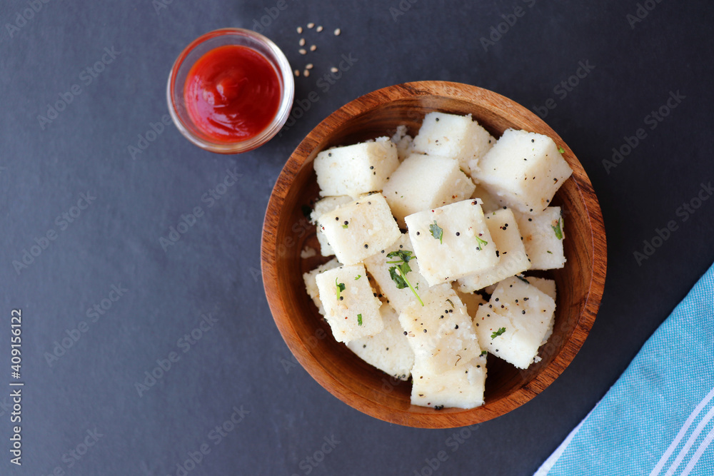 Indian popular Gujrati breakfast dish White Dhokla, Khatta Dhokla, Rice and Urad Dal Khaman. Also known as Instant Rava Dhokla. served with ketchup over black background. copy space.