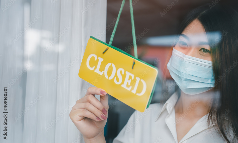 Close up of young woman wearing mask and hand turning closed sign board on glass door in coffee shop