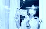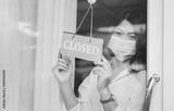 Close up of young woman wearing mask and hand turning closed sign board on glass door in coffee shop