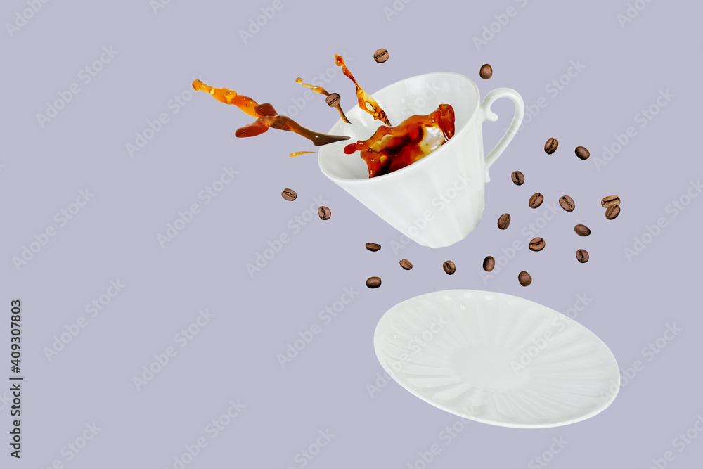 Levitating white porcelain cup with splash of coffee and saucer. Coffee beans flying nearby on gray-blue background.