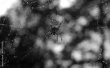 A large poisonous spider is waiting for the victim on the web, there are many raindrops around