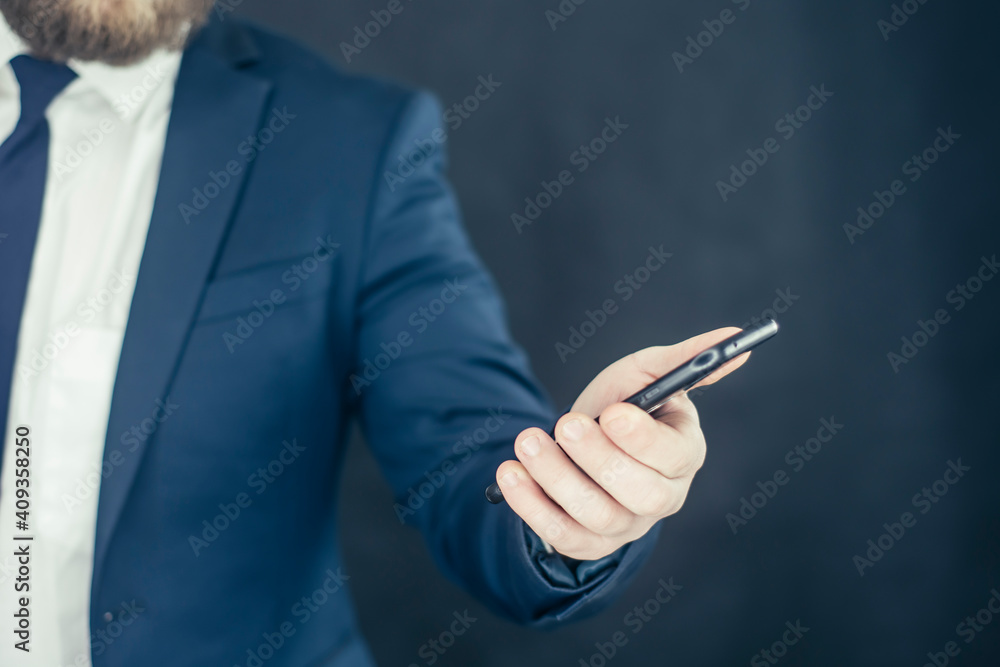 Businessman in a shirt and a blue jacket with smartphone in hand.