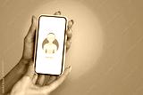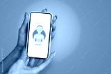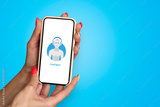 Girl with beautiful nails holds smartphone close-up with icon Chat Bot.