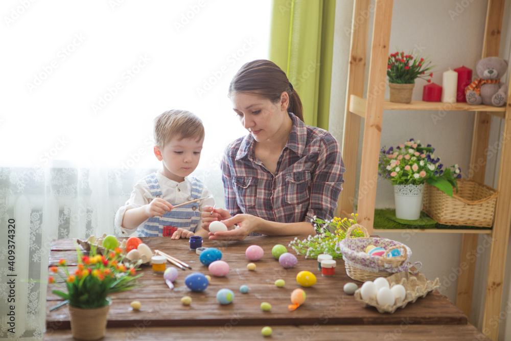 Mother and her son painting Easter eggs. Happy family preparing for Easter day