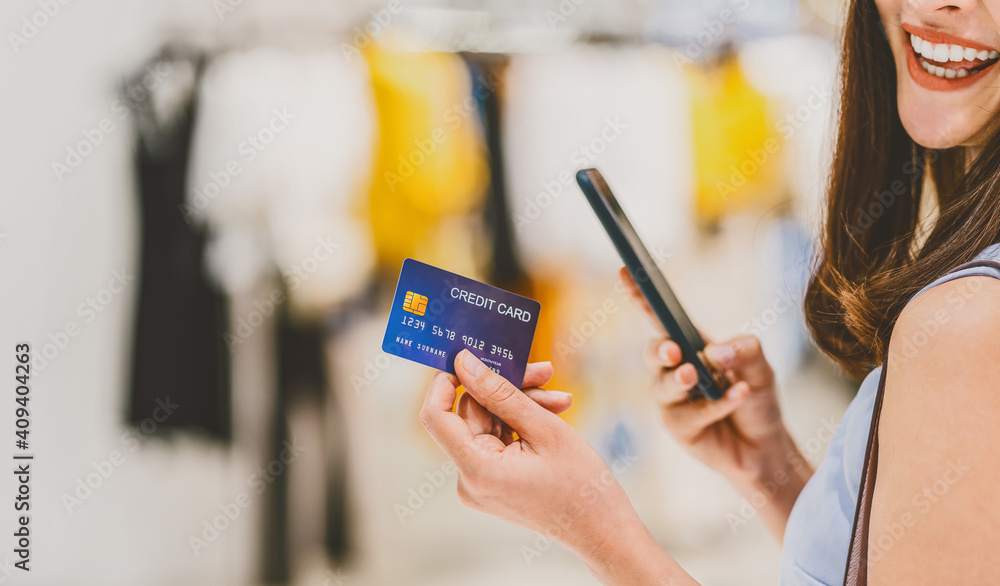 Banner and web page or cover template of Asian woman using credit card with mobile phone for online shopping in department store over the clothes shop store background, credit card mockup