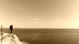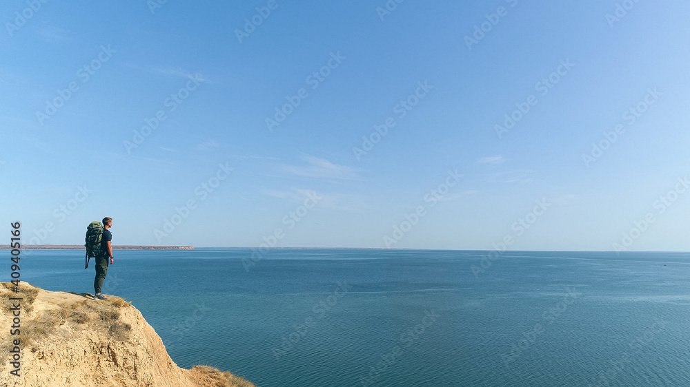 The man with a backpack standing on a mountain on the sea background