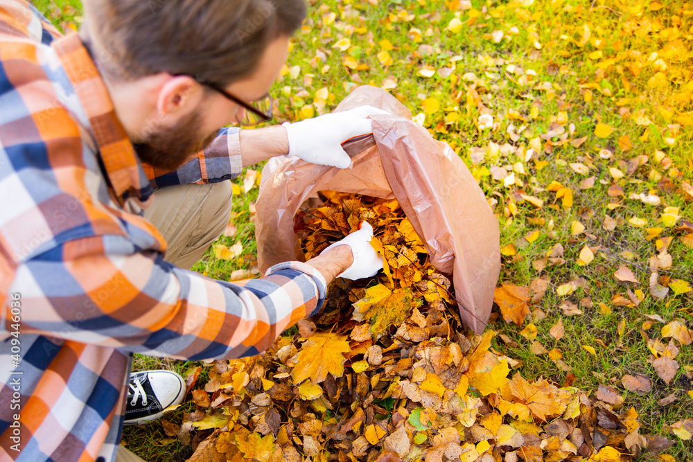 Collecting autumn leaves to a plastic bag for bio waste. Autumn garden works.