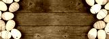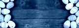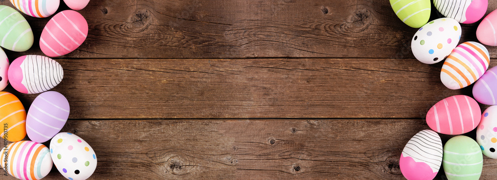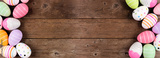 Colorful Easter Egg double side border. Above view against a rustic wood banner background. Copy space.