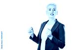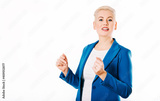 Studio portrait of expressive talking middle age woman, posing at studio on white background, wearing blue jacket
