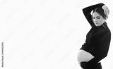 Studio maternity portrait of gorgeous young woman, posing on white background, wearing black turtle neck top