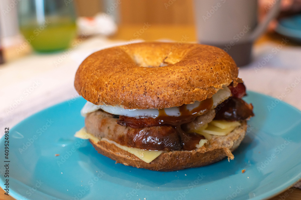 Sausage Bacon and Egg Bagel breakfast