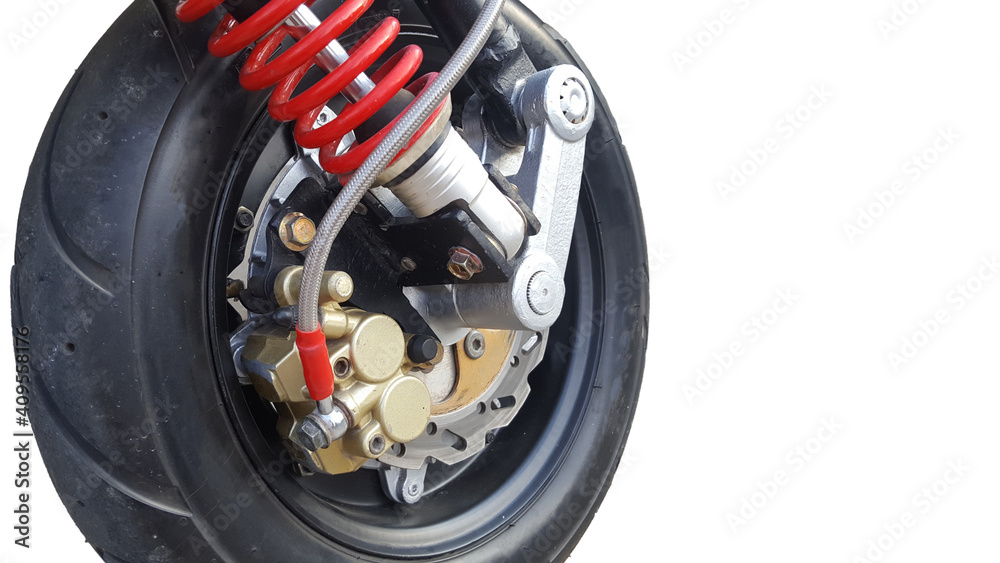 The front wheel is modified by a scooter motorbike with the addition of disc brakes and modern suspension for a more comfortable ride