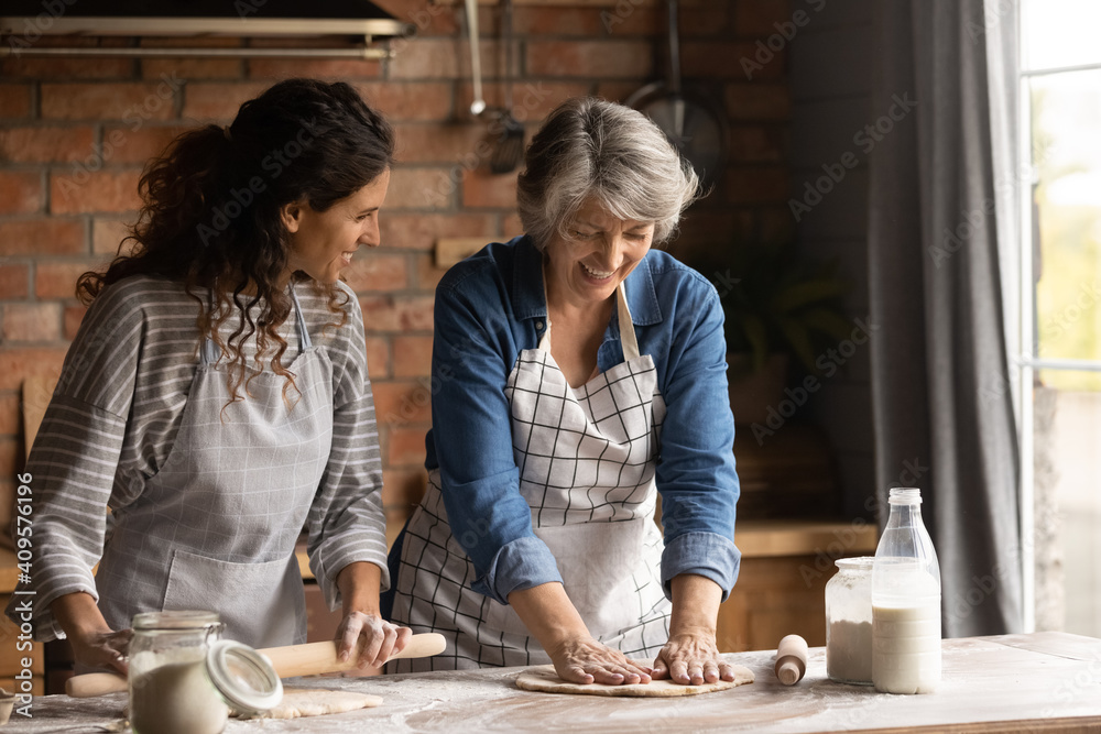 Happy mature grey haired woman with grownup daughter wearing aprons cooking handmade pastry, rolling dough, chatting, having fun, standing in kitchen at home, family spending leisure time together