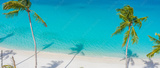 Palm trees shadow on the sandy beach and turquoise ocean from above. Amazing summer nature landscape. Stunning sunny beach scenery, relaxing peaceful and inspirational beach vacation template
