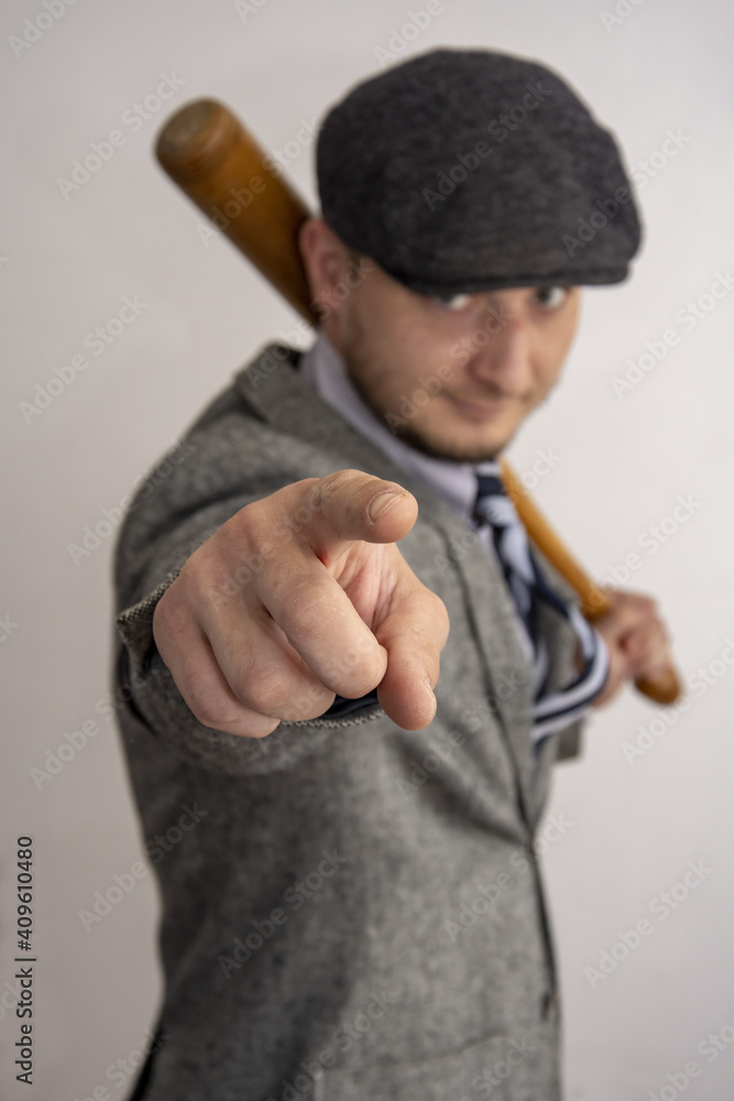 Portrait of a 35-year-old man in a cap and with a baseball bat on a light background. Concept: yard bullies and bouncers, street gang, and violators of the law.