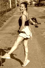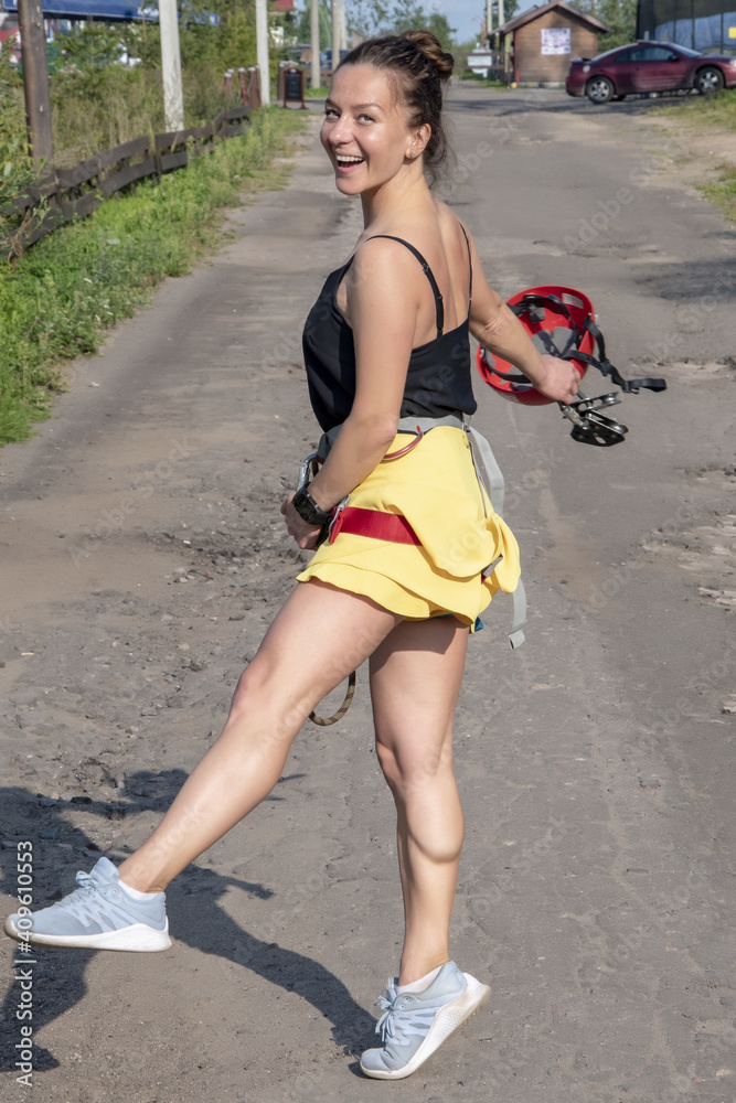 An active woman of 35-40 years old in climbing equipment with a helmet in her hand poses for the camera. Concept, sports and outdoor activities, extreme entertainment in the summer.