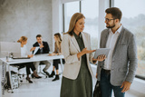 Man and woman business couple discussing with digital tablet in the office with young people works behind them