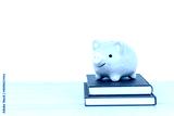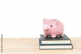 Pink piggy bank on top of books on wooden desk on white background, concept saving for education and scholarship