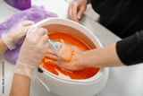 Professional manicure master is doing nails for happy client in beauty salon