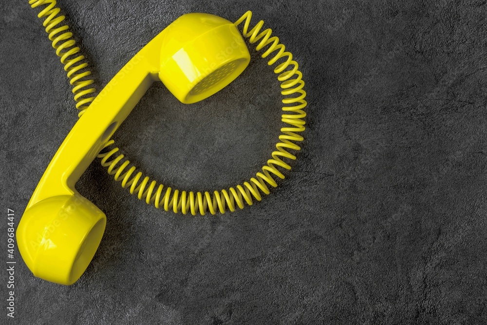 Yellow retro telephone with wire on gray marble background. Horizontal position