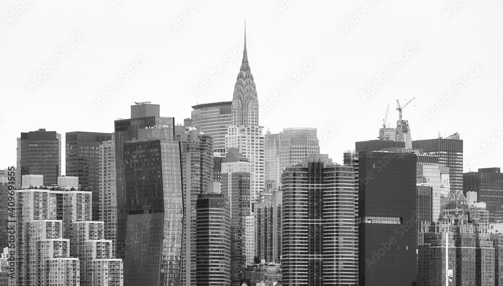 Black and white picture of Manhattan skyline, New York City, USA.