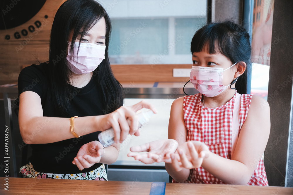 Asian mother and daughter wearing mask using alcohol spray for prevent the Covid-19