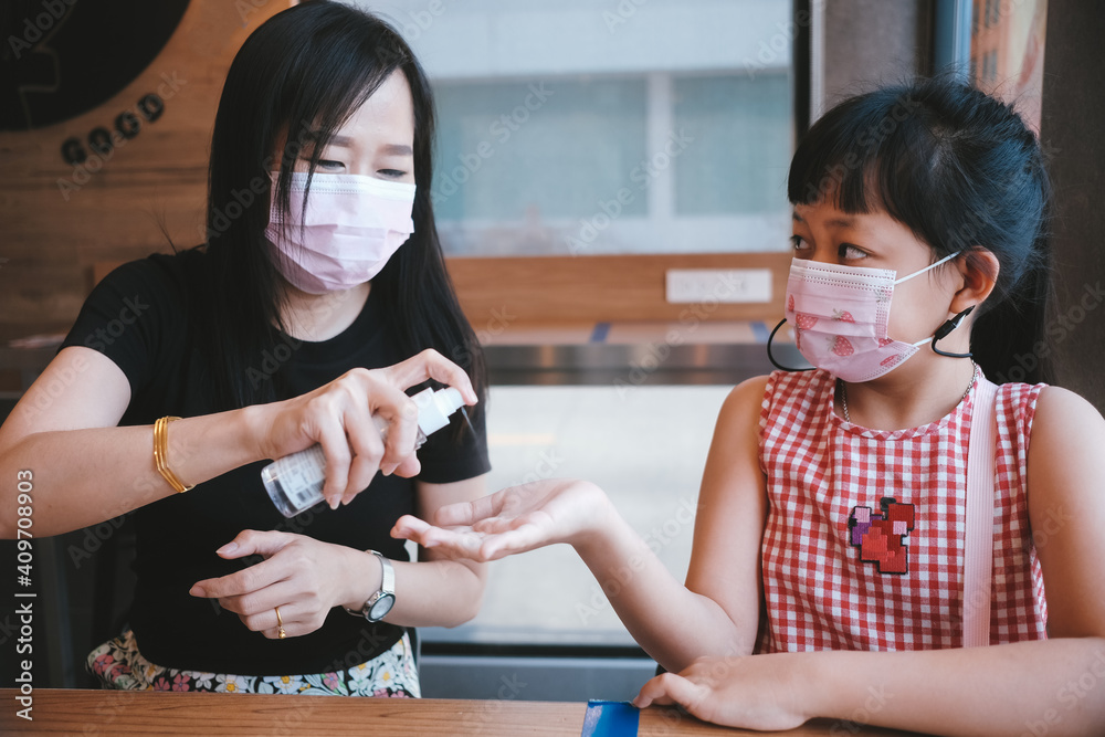 Asian mother and daughter wearing mask using alcohol spray for prevent the Covid-19