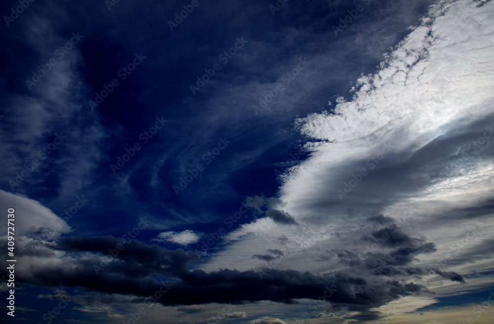 Sky with different types of clouds including a band of so called mackerel sky, indicator of a weather change