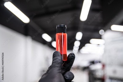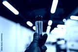Man chemist holding tube with just invented solution liquid. Red liquid in probe