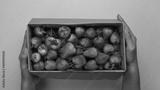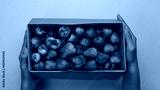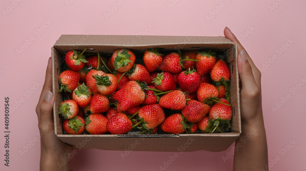Overhead shot of woman holding box with fresh strawberry on pastel pink background.