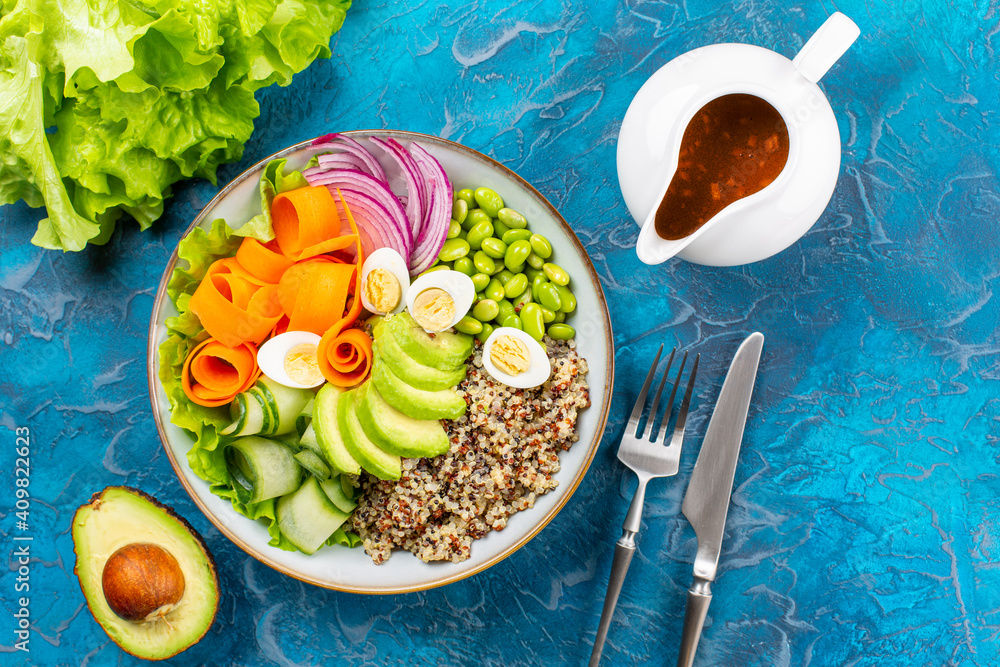 Buddha bowl with quail eggs, healthy food concept. Quinoa, edamame beans, avocado, ququmber, carrot, red onion and green salad. Sauce made from peanut butter, soy sauce, garlic and ginger.