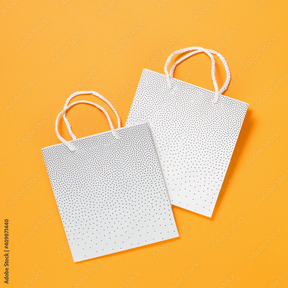 Two blank mockup white shopping bags on orange background. Shopping or sale concept
