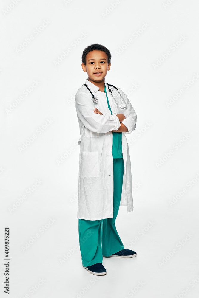 Portrait of handsome African boy wearing a doctor coat with phonendoscope, standing on white background. Choosing a future profession for a child
