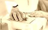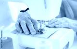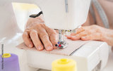 Close up view of old woman hands sewing on machine