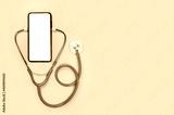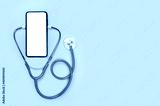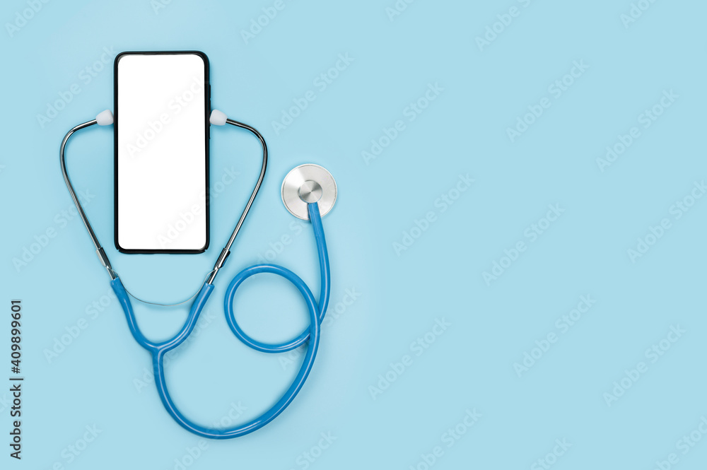 online doctor. app health phone mockup. get an online consultation from doctor by mobile phone. stethoscope and cell phone on blue background.