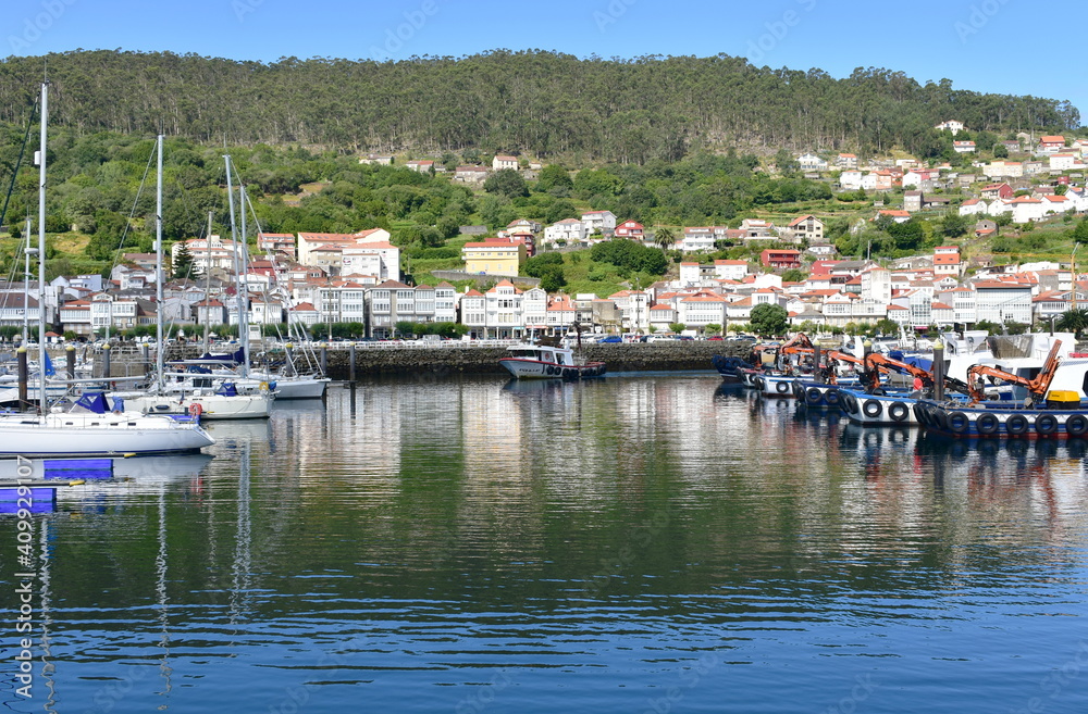 Harbor and coastal village with galician fishing boats and sailing boats at famous Rias Baixas in Galicia Region.