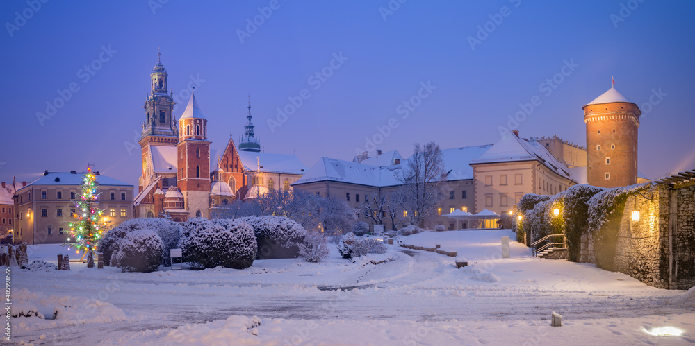 Illuminated Christmas tree on snow at night, Wawel cathedral and castle, Krakow, Poland