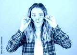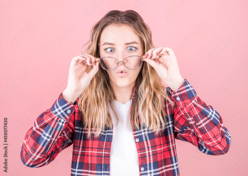 Young woman in a red shirt with glasses is very surprised, looking at the camera and lowering her glasses. Surprise and shopping concept on pink background.