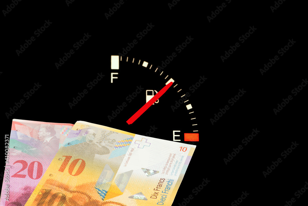 Tankanzeige, Geld Schweizer Franken und Benzinpreis in der Schweiz