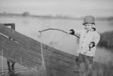 Little Boy Catching a Fish from wooden dock