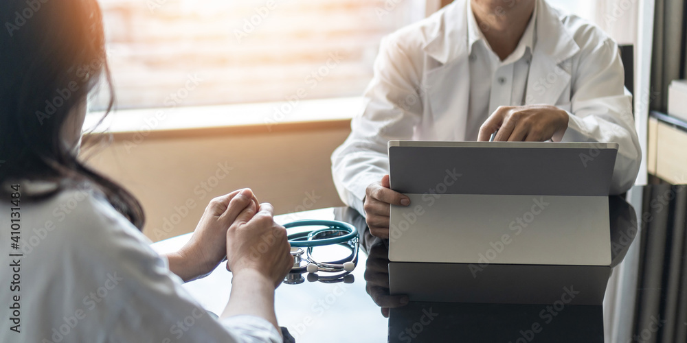 Menopause woman, stressful patient consulting with doctor or psychiatrist counselor who diagnostic examining on mental health illness or obstetric - gynaecological disorder in medical clinic