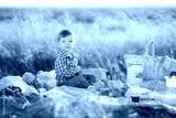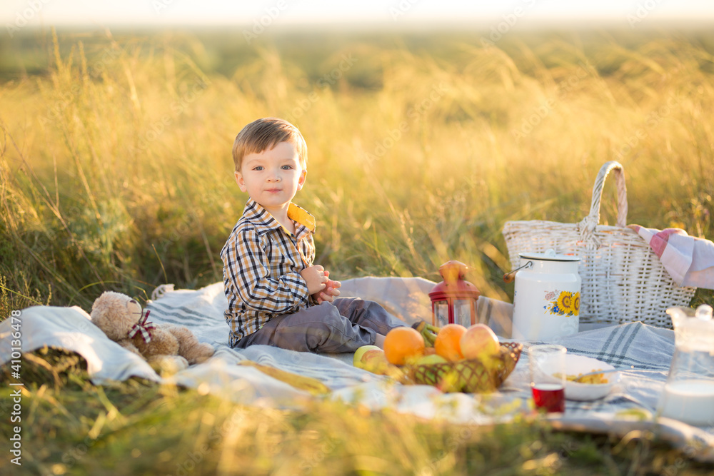 Great time is childhood. Boy kid with Teddy bear and fruit on a picnic in sunny day