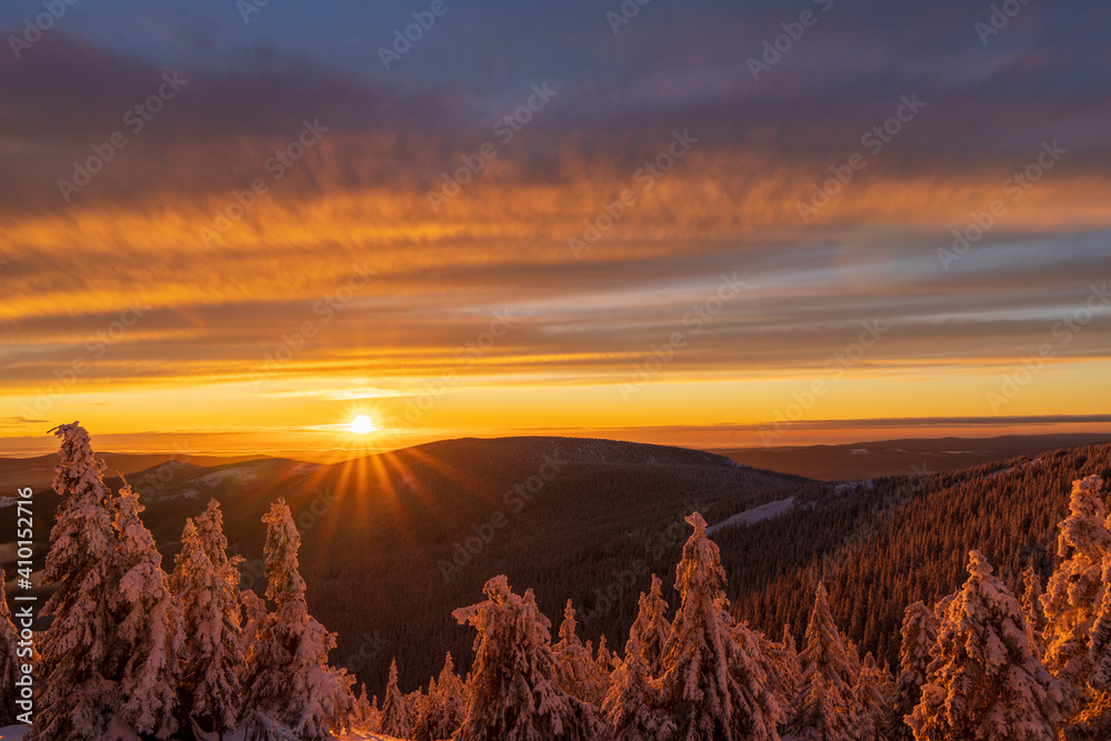 Majestic sunset in the winter mountains landscape. High resolution image. Kralicky snežník czech