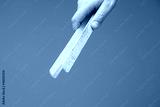 Caucasian male hand holding a wooden tong close up shot isolated on gray background