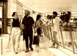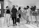 Happy couple shopping together in the mall. Smiling loving couple holding hands and enjoying in shopping mall