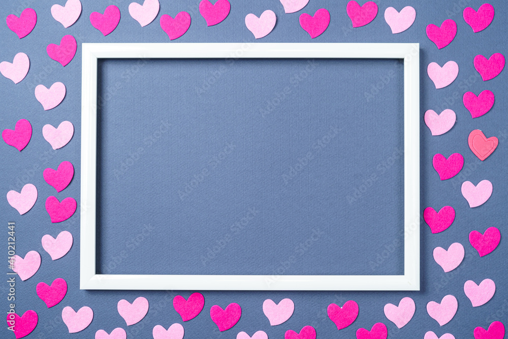 Elements in shape of hearts on dark blue background surrounding white frame. Symbols of love for Happy Women's, Mother's, Valentine's Day, birthday greeting card design.