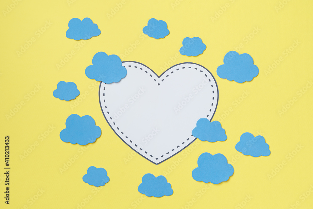 Elements in shape of clouds surrounding white heart with space for text on yellow background. Symbols of love for Happy Women's, Mother's, Valentine's Day