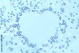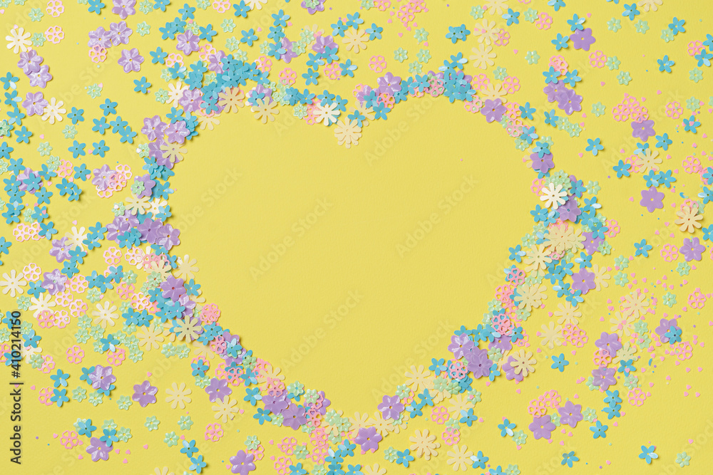 Shape of white heart with copy space on yellow background surrounded by small colorful flowers. Symbols of love for Happy Women's, Mother's, Valentine's Day