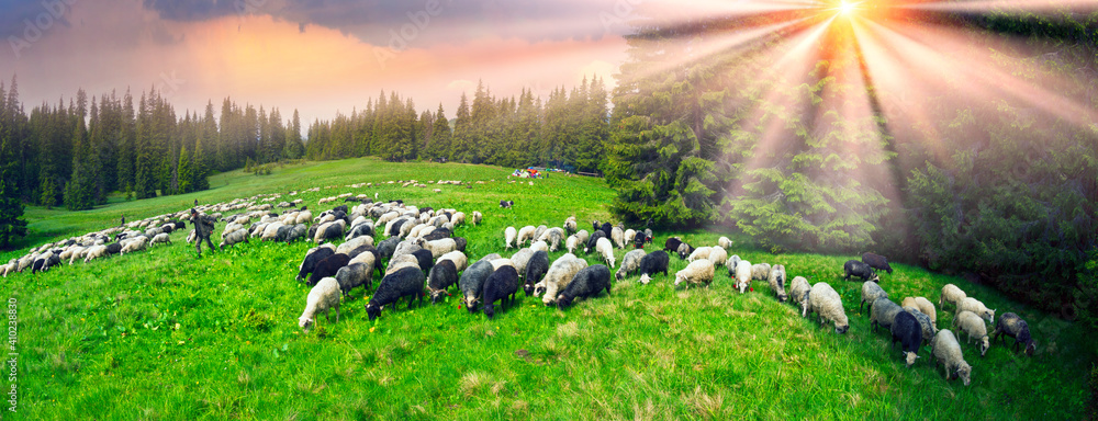 Sheep graze on the polonina Lemskaya
