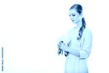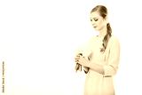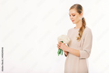 Studio portrait of beautiful young woman wearing beige bodycon dress, holding white buttercup flowers